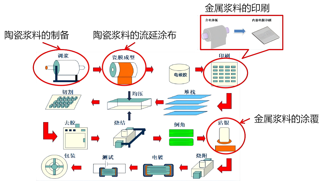 在MLCC的制作工藝中,會在制備和流延涂布環節用到陶瓷漿料,在印刷內電極和涂覆外電極的環節用到金屬漿料。