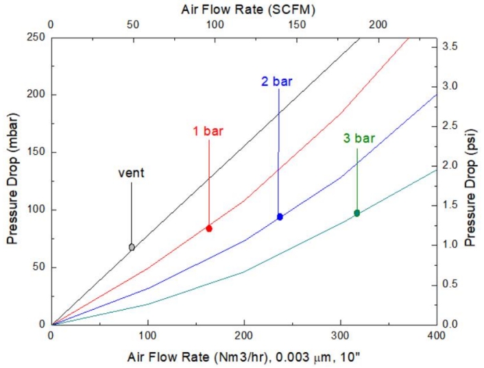 *測試氣體為壓縮空氣,測試壓力vent,1bar,2bar,3bar為出口壓力。