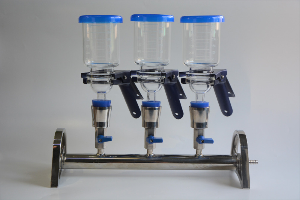MS三聯(lián)過(guò)濾器由三個(gè)溶劑過(guò)濾器串聯(lián)而成、一次可同時(shí)過(guò)濾多個(gè)樣品。每個(gè)過(guò)濾孔均可獨(dú)立控制,可連接多種類型的漏斗,可蒸汽滅菌。標(biāo)準(zhǔn)多聯(lián)過(guò)濾器支架采用不銹鋼材質(zhì),換膜過(guò)濾器為特硬玻璃。三聯(lián)多聯(lián)過(guò)濾器使用時(shí),只需一個(gè)真空泵,即可同時(shí)過(guò)濾多達(dá)多個(gè)樣品,過(guò)濾支架每個(gè)支座都備有獨(dú)立的控制閥門,具有安裝簡(jiǎn)便、易消毒,提高平行實(shí)驗(yàn)準(zhǔn)確度,減少重復(fù)性過(guò)濾試驗(yàn)次數(shù)等特點(diǎn)。