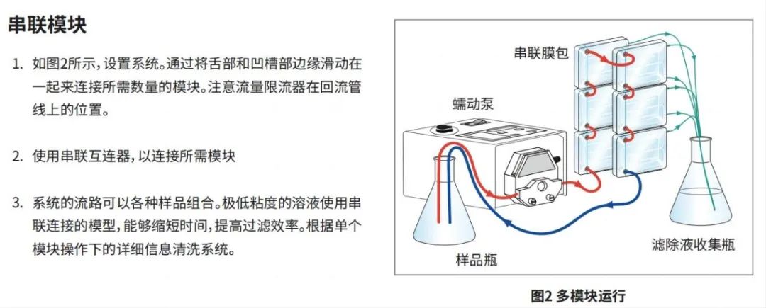 PRISM 50的模塊化設計使多個模塊串聯操作。這將最大吞吐量提高到3升,并與膜面積成比例地加快處理速度(見下圖)。